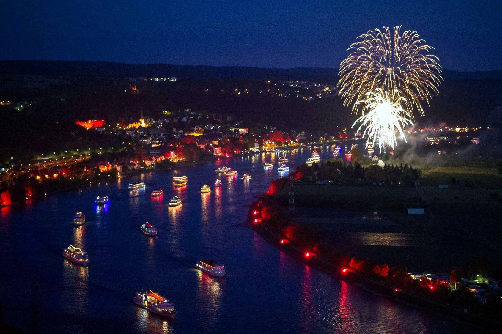 Rhein in Flammen – Bonn (Rhine in Flames Festival, Bonn) is one of Germany’s most spectacular pyrotechnic and river festivals, held each May along the scenic Rhine River. The highlight is a breathtaking fireworks display synchronized with music, illuminating the riverbanks, hills, and castles between Bonn and Linz. A flotilla of decorated ships, glowing in red light, sails in procession beneath the fireworks, while thousands of spectators enjoy open-air concerts, regional food, and a festive riverside atmosphere. Combining natural beauty, artistry, and celebration, the Rhine in Flames Festival transforms the Rhine Valley into a glowing spectacle of color and sound.