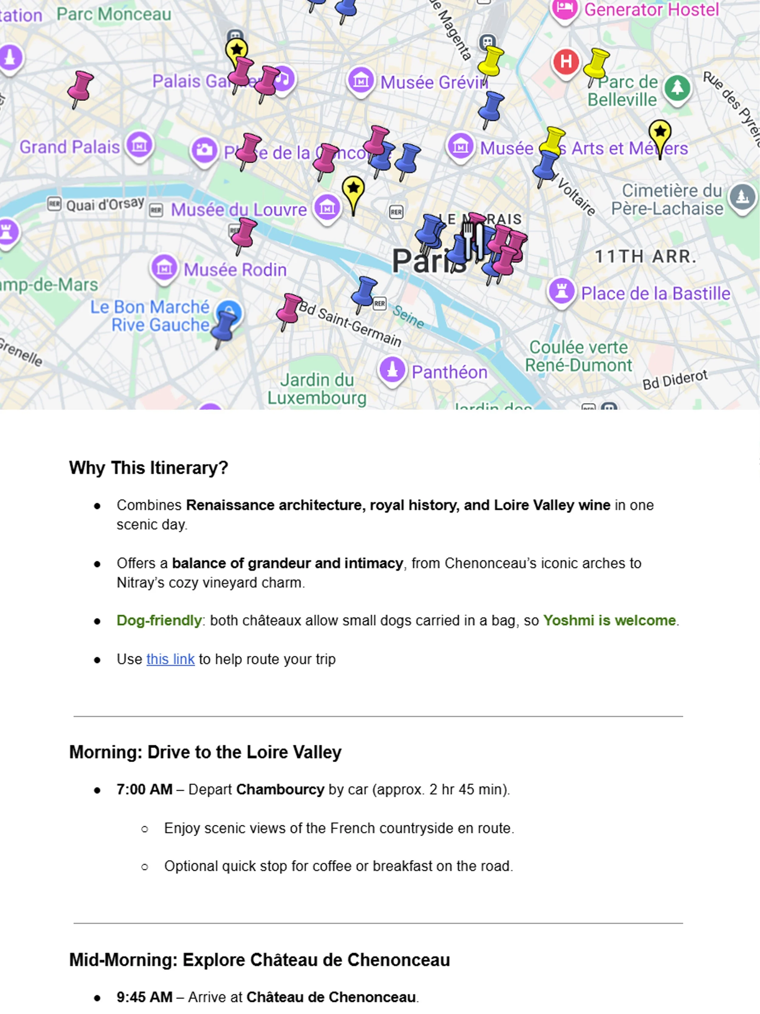 Full Trip Design: fully pinned map (sights, food, neighborhoods, essentials)